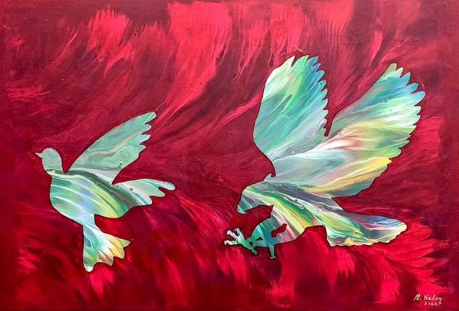 Rafet Öztan. Renklerin Dili- Kuş Serisi. 35x50 cm. Tuval üzeri akrilik boya. İmzalı.