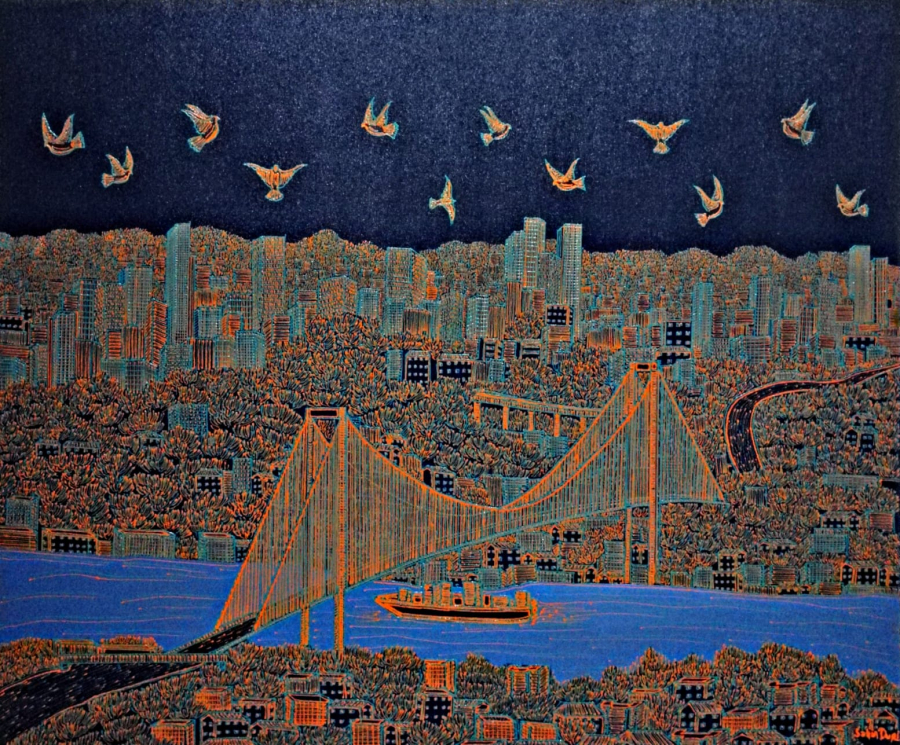 Şahin Duri. Boğaziçi Köprüsü. 100x130 cm. Tuval üzeri akrilik boya. İmzalı.